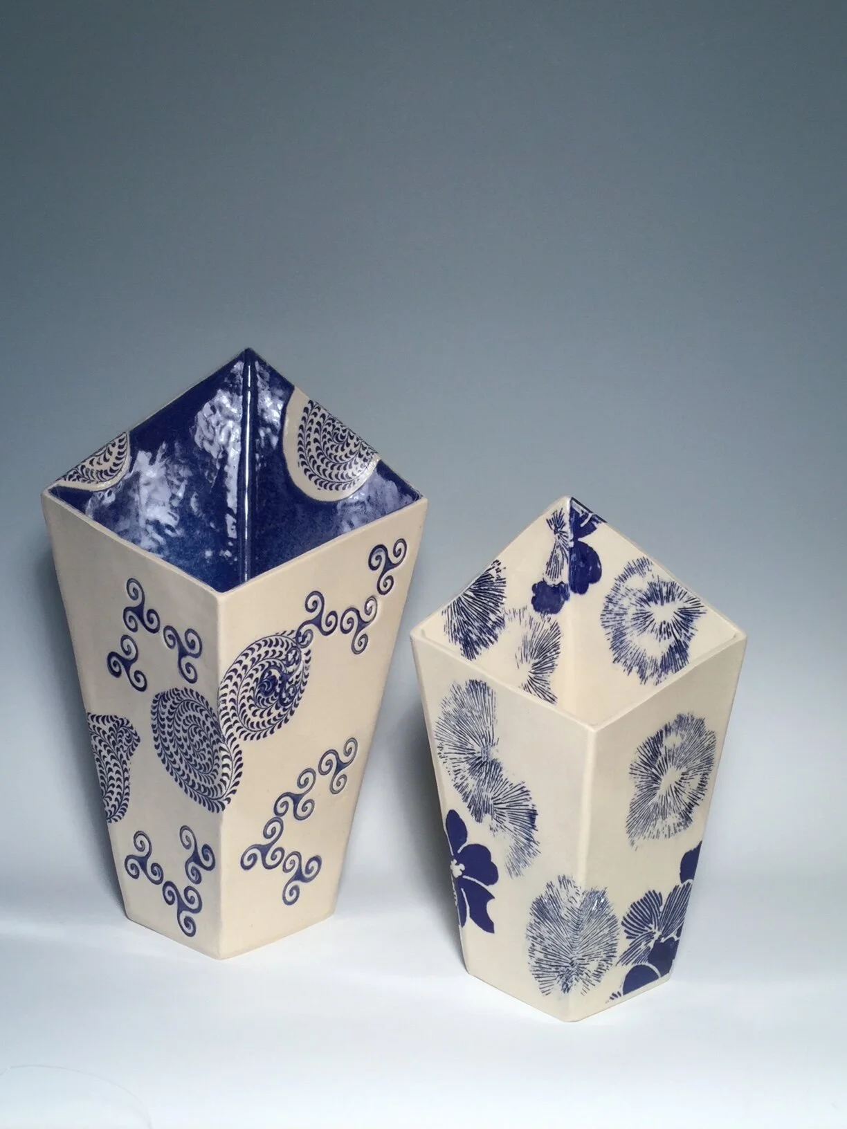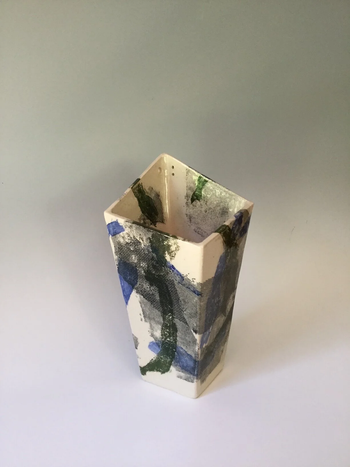 Slab built with mono-printed designs in blue, green and black