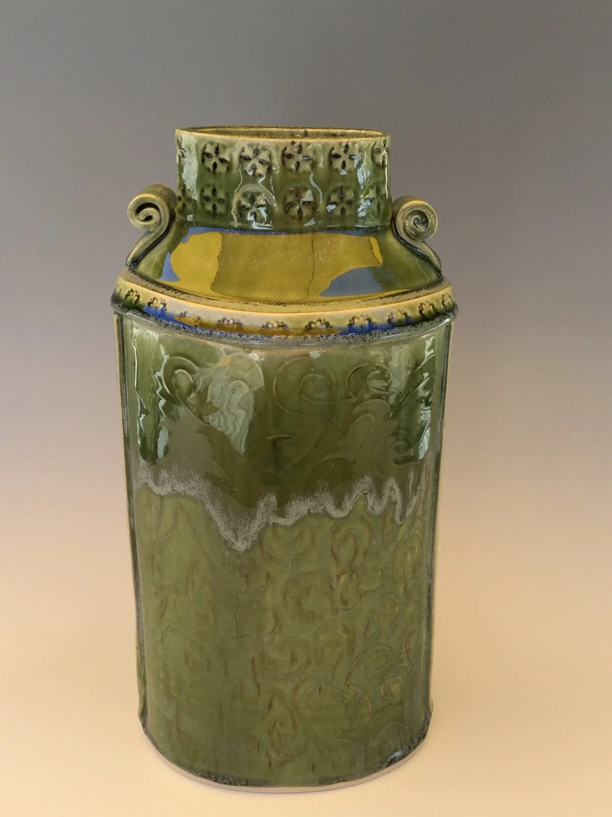 Slab built medium vessel with brown underglaze design below spearmint glaze