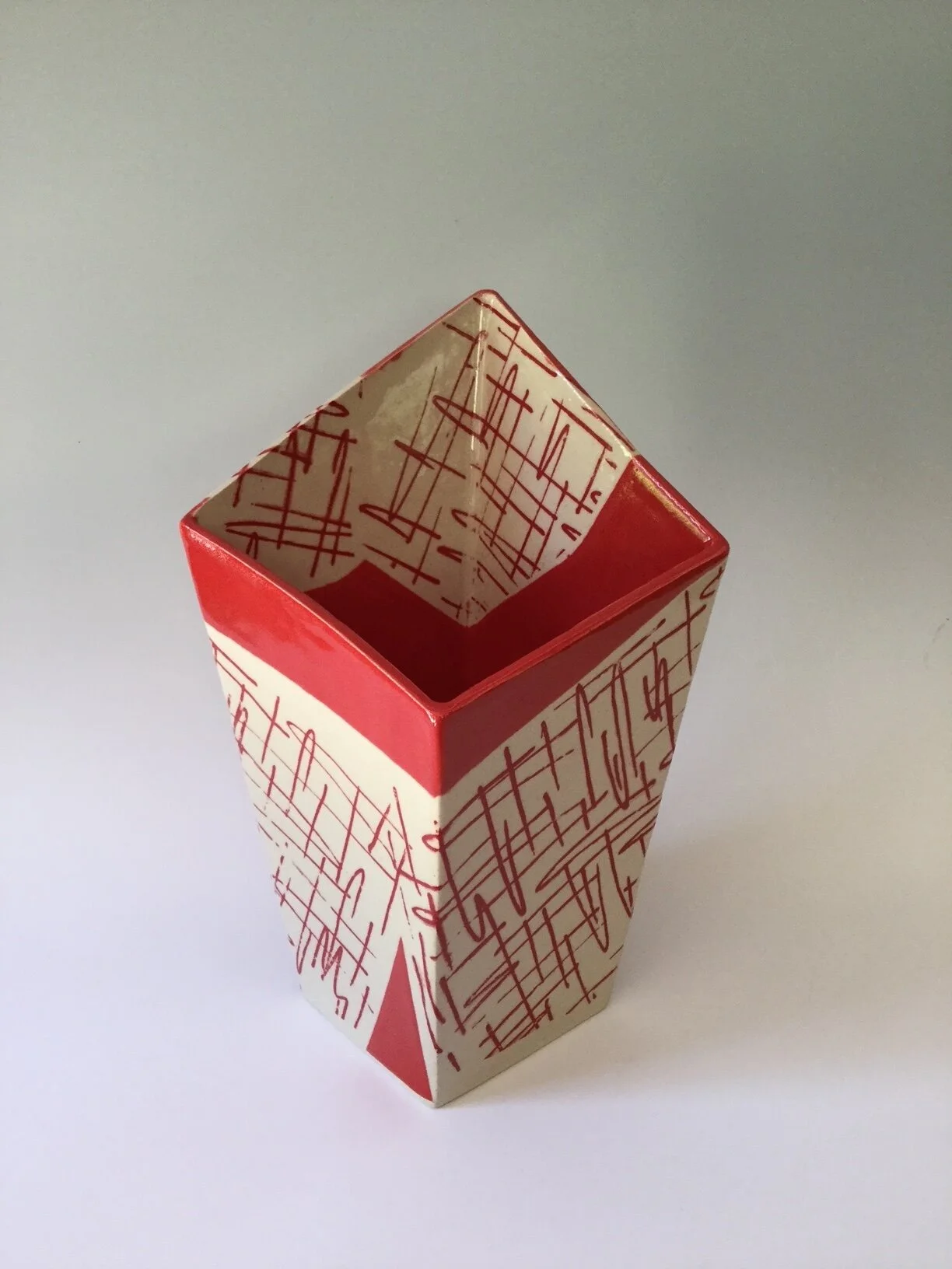Slab built with screen printed red design and red glaze